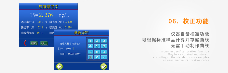 儀器自備校準(zhǔn)功能,可根據(jù)標(biāo)準(zhǔn)樣品計(jì)算并存儲曲線,無需手動制作曲線;